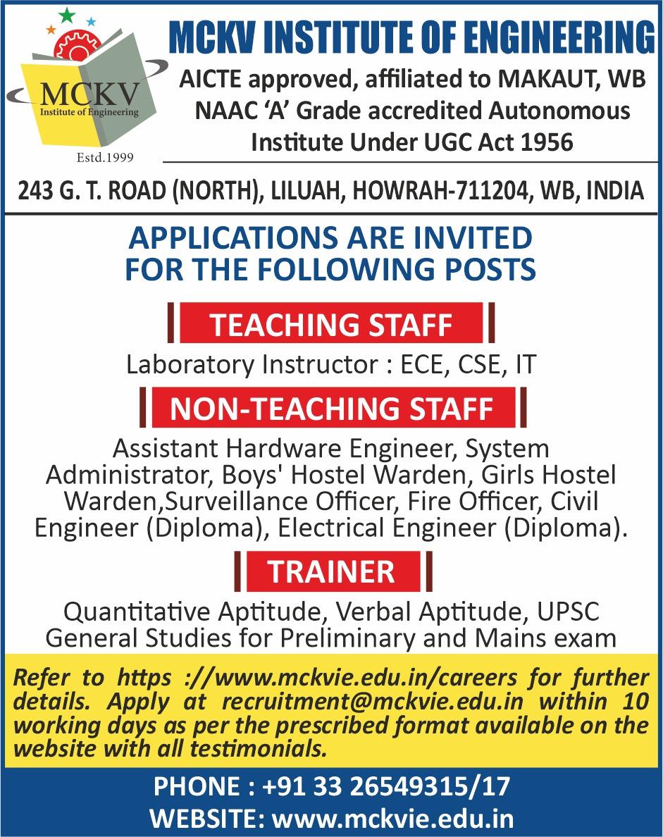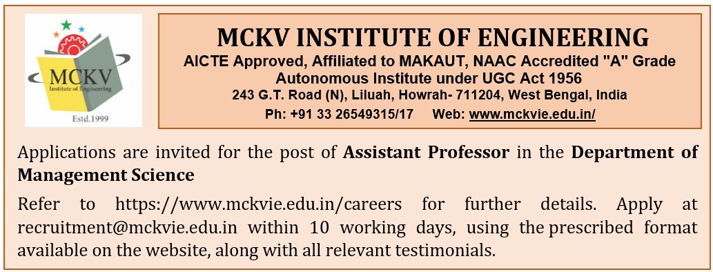 Advertisement for the post of Assistant Professor in Management Science and Laboratory Instructor in Computer Science and Engineering (Advt No. MCKVIE/2025/02): For details, please click here